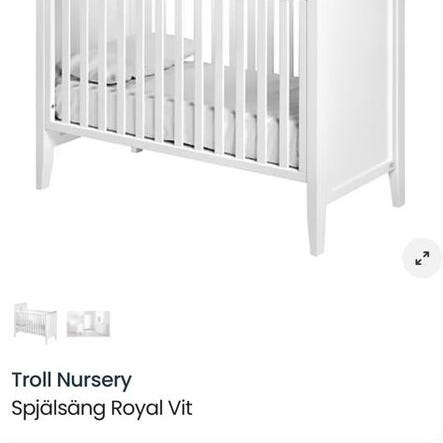 Vit spjälsäng med dropside. Den ena sidan kan smidigt dras ner och bottenplattan kan justeras till tre olika nivåer. I gott skick. Enda skavanken är att vår son gnagt bort lite färg från det översa lagret (se bild). Nypris 2995kr.