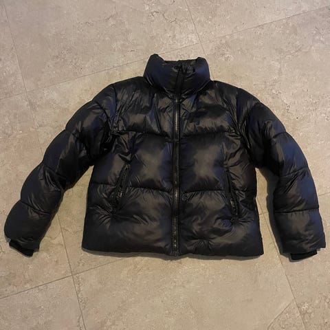 Jackan är brun/grön och med exklusiv dun-filling. Har en dragsko i midjan men passar unisex.