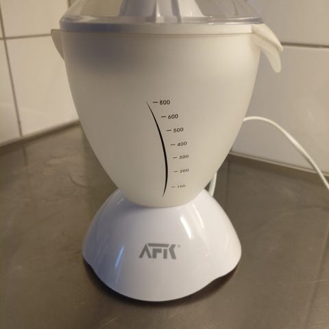 Coline citruspress i plast med elektrisk funktion och genomskinlig behållare. Utrustad med en vit presskupa och ett lock. Ansluts med sladd och kontakt för eluttag.