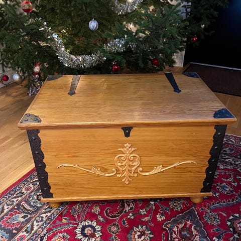 Antik trälåda / brudkista med målade dekorationer. Lådan har ett lock som kan låsas med nyckel och handtag på sidan. Invändigt är den målad i en ljust grågrön linoljefärg och har ett praktiskt förvaringsfack på ena sidan.