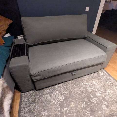 Soffan kan användas som både sittmöbel och säng, med en utdragbar bäddfunktion. Passar för mindre utrymmen och kan enkelt omvandlas från soffa till säng. Överdrag saknas, men finns på IKEA. Se bilder.