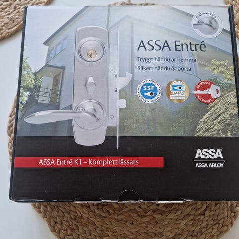 Helt ny, komplett låssats för ytterdörr från ASSA ABLOY, modell Entré d12-K1 i matt krom. Passar som standardlösning för entrédörr och levereras som komplett sats med handtag, cylinder och tillbehör för montering.