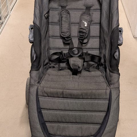 Baby Jogger barnvagn i svart färg. Barnvagnen har sufflett med ventilationslucka och säkerhetsbälte. Den är utformad för barn och har hjul för enkel förflyttning.