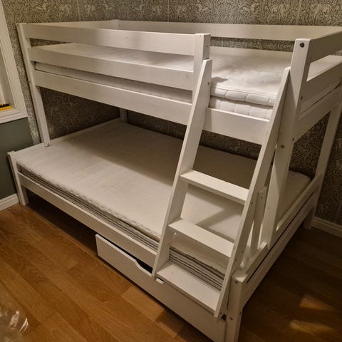Nedre säng har måtten 105 cm x 200 cm och övre säng 80 cm x 200 cm.