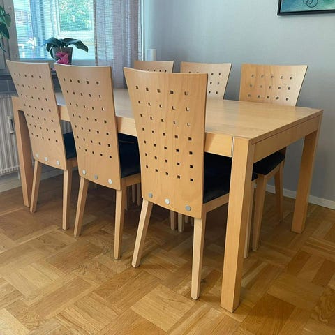 Säljer ett köksbord från Mio i felfritt skick. Laminatskiva vilket gör att det inte blir några märken i bordet. 6 stolar medföljer i priset. Stolarna är slitna i skinnklädseln men stabila och hela. Bordsben och stolarna är i vitlaserad ek. Ovalt matbord.