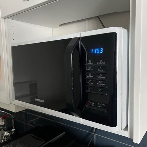 Samsung mikrovågsugn i vit färg. Utrustad med digitalt display och vred för inställningar. Passar för uppvärmning och tillagning av mat.