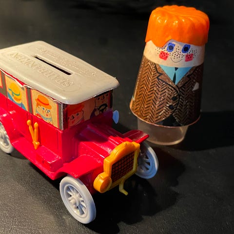 En relik från tiden när småslantarna sparades i en rolig Sparbössa. Joakim von Anka sitter och vaktar på kassakistan.