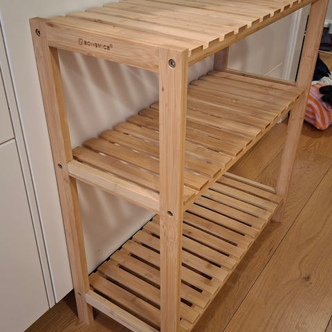 Hylla i trä med tre hyllplan. Hyllan har en A-form, dvs lite utställda ben.