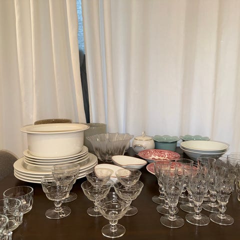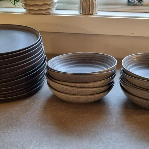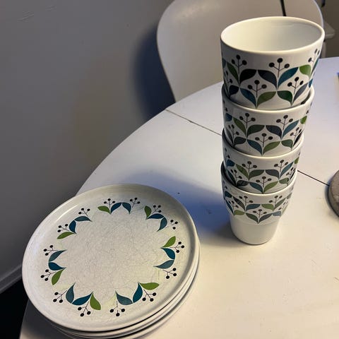 Sagaform tallrikar och skålar i keramik med dekorativa sol- och chilimotiv i gul färg. Setet innehåller sex tallrikar och fyra skålar med matchande design. Plus 1 skål för tillbehör. Visa besticksträck finns men i bra skick. Kul för taco fantasten!