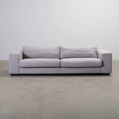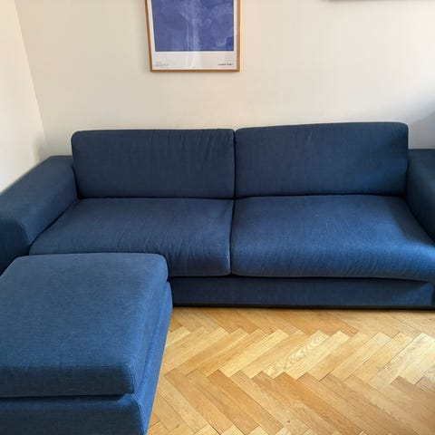 Grå soffa från Bolia, modell Skandinavia. Använd men i bra skick. Två grå soffkuddar i matchande tyg ingår. Träben i ek.