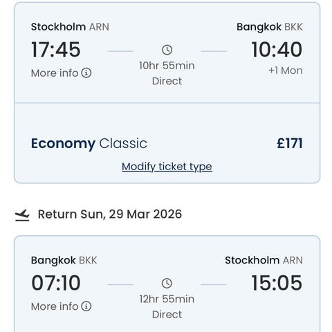 Nu finns chansen att fynda två biljetter med direktflyg med Norse air från Arlanda till Bangkok 4-28/3.
