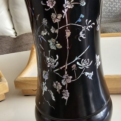 Fin stor svart vas med silverfärgade och svarta blommor på.