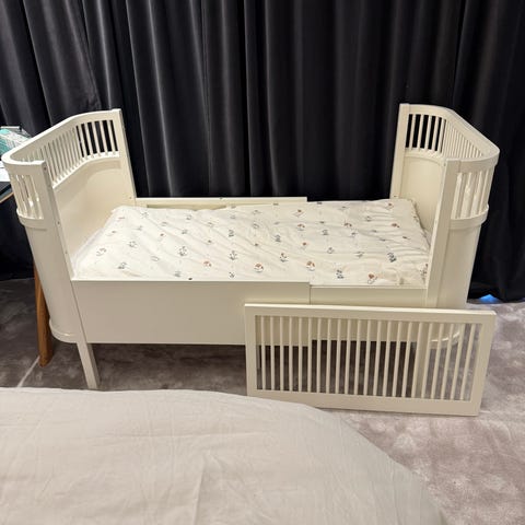 Madrass i original medföljer. Aldrig använd som juniorsäng så förlängningsdelen på den madrassen är ny i förpackning.