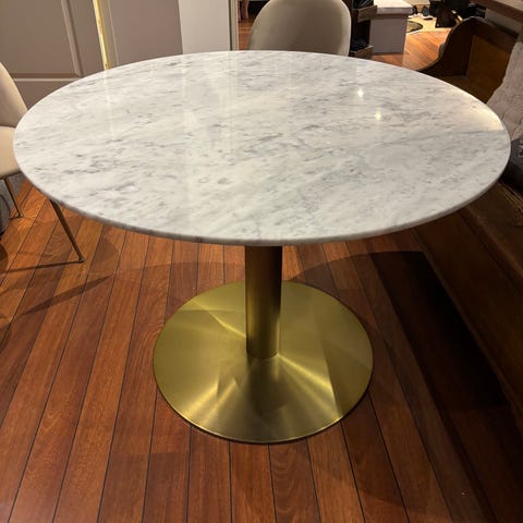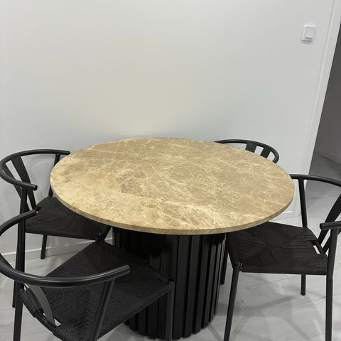 Mio matbord med rund form och vit marmorskiva. Skivan är tillverkad av laminat med guldfärgad ABS-kant och underredet av guldfärgat rostfritt stål. Passar för olika inredningsstilar. 4 klädd stolar mörkbeige och guld