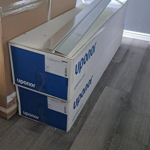 Säljer detta kompletta fördelarskåp för golvvärme med ram och botten då det bara har legat i garaget i flera år och aldrig blivit använt. Ska rymma shunt och pump också.