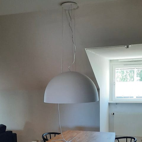 Fin taklampa. Modell: Caravaggio P3. Höjd 51cm, diameter 40cm.