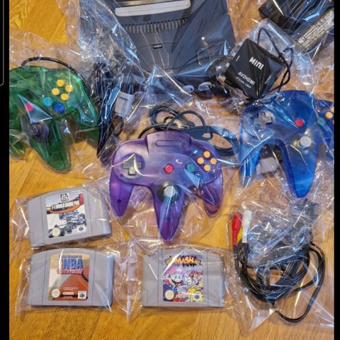 Säljer ett större Nintendo 64 Special Value Pak Golden Eye-paket i gott skick. Konsollen är testad och fungerar bra. Perfekt för dig som vill ha ett komplett retro-paket eller för samlare.
