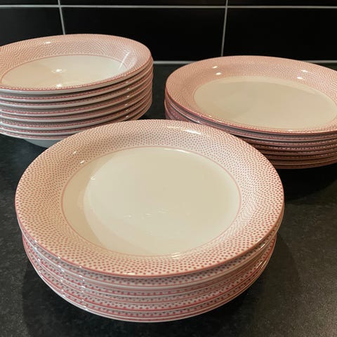 Rörstrand servisdelar i vitt porslin med guldkant. Serien Cosmos. Setet innehåller tallrikar, skålar, uppläggningsfat och koppar med fat. Ca 10 stycken av varje tallrik. Några delar är lite kantstötta.