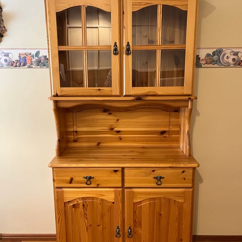 Vitrinskåp/skänk i massiv furu med naturfärgad träyta. Överdel med två dörrar och invändiga hyllplan samt öppen avställningsyta under. Underdel med två dörrar och flera hyllplan för förvaring. Passar exempelvis i kök, matsal eller vardagsrum för förvaring av porslin, glas, textilier eller andra hushållsartiklar.