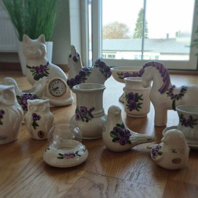 Set med fyra spargrisar i porslin, av olika storlekar. Varje sparbössa är vit med blomdekor i flera färger. Några är från Guldkroken i Hjo, den näst minsta är tysk. Storlekar: 20, 15, 7 och 5 cm höga.Mitten grisen 12 cm har rymt han hade en sedelfemma i magen.
