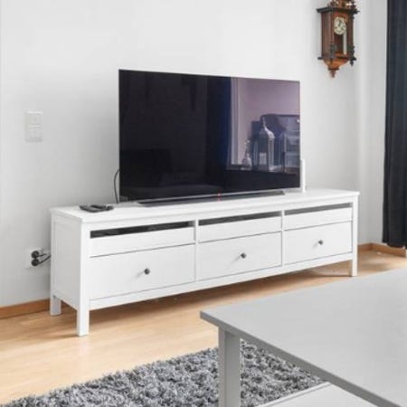 Möbeln har fyra lådor och öppna hyllor för förvaring.