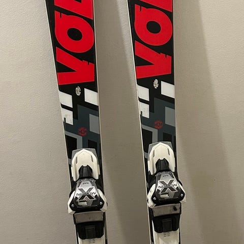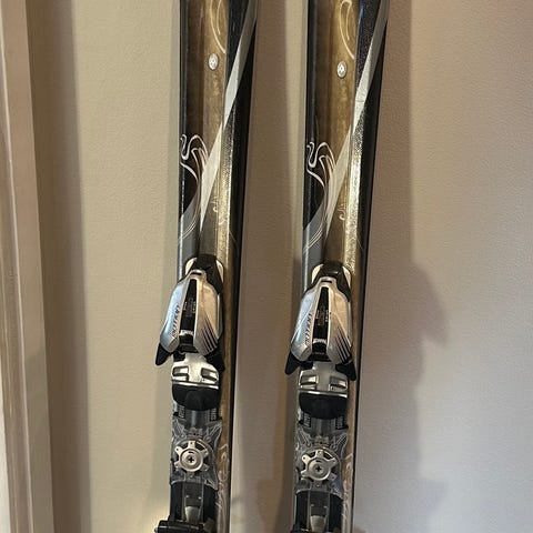 Alpinskidor i begagnat skick med normalt bruksslitage.