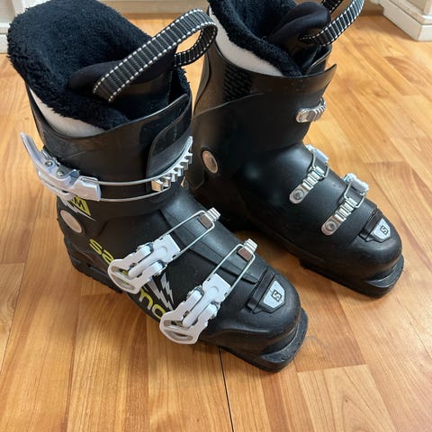 Salomon skidpjäxor. Pjäxorna har fyra spännen för justering och stöd. Känns lite mer påkostade än många barnpjäxor. Storlek 22.0 (EU 35). Sonen har gillat dem men vuxit ur dem.