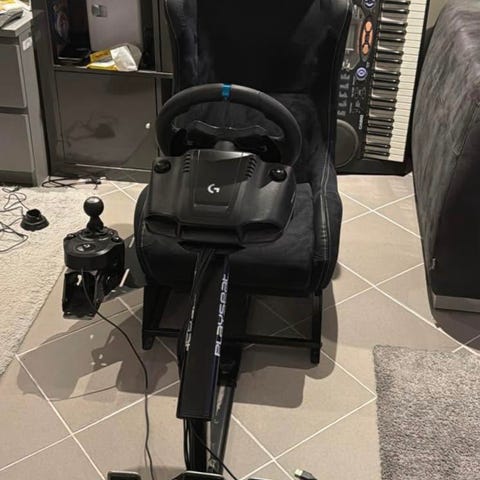 Säljer en stabil och skön simracing-setup. Ställningen är egenbyggd i trä, vilket gör den väldigt robust och stadig utan glapp.
