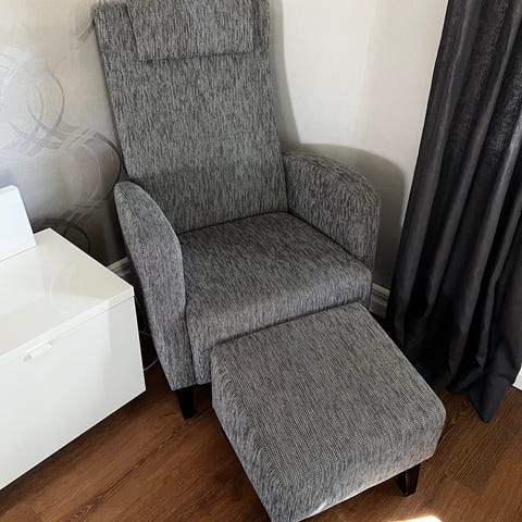 Snygg och lättplacerad fåtölj i mörkgrått tyg.