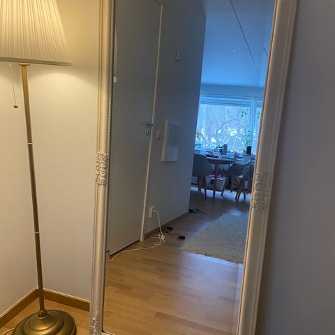 Spegel med låda i vit färg. Spegeln är fristående med en enkel design och har en liten låda med dekorativt mönster på insidan. Produkten är tillverkad i trä och passar för förvaring av små föremål samt som spegel.