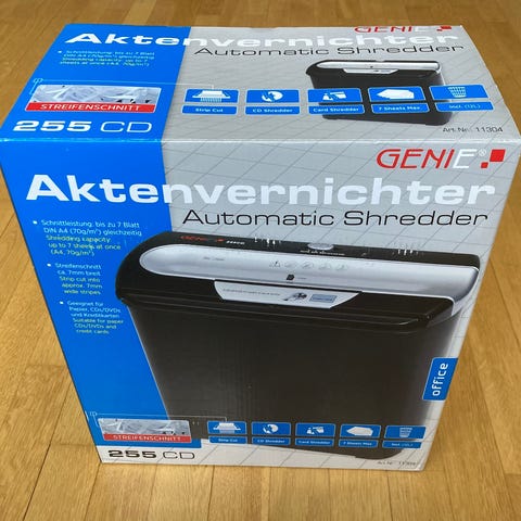Dokumentförstörare i vit färg. Används för att förstöra papper och dokument på ett säkert sätt. Passar för kontorsbruk eller hemmabruk.