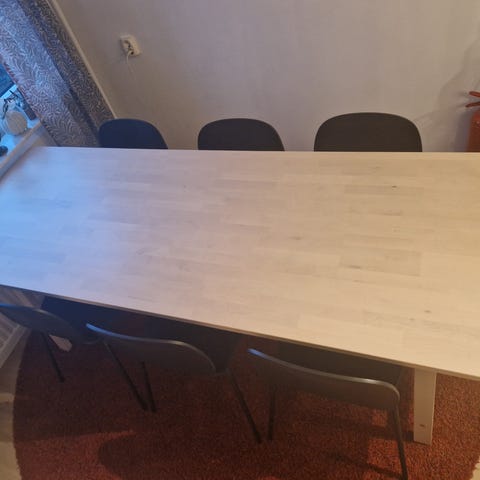 Robust matbord från Ikea. 2 iläggsskivor á 42,5cm. Total längd blir då 2.60cm. . Man kan sitta ca 12-14 pers som max då. Iläggsskivor förvaras under bordsskivan.
