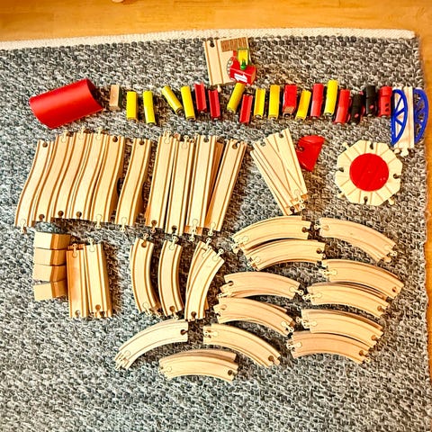 IKEA barnleksak tågbana tillverkad i trä. Innehåller olika delar för att bygga en tågbana, inklusive räls, tåg och tillbehör i flera färger.