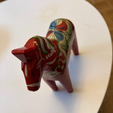 Föremålet på bilden är en dalahäst, en traditionell svensk trähäst med målad dekor.