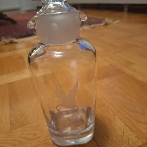 Glasflaska med ingraverat motiv av ett segelfartyg. Flaskan är fyrkantig med en glaspropp och har en höjd på cirka 25 cm. Flaskan är genomskinlig och tillverkad i glas. Fartygsflaggan är den svenska flaggan.