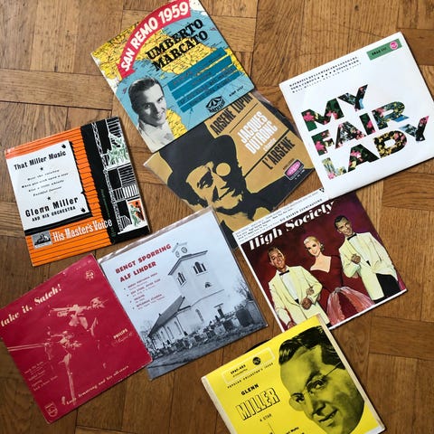 En samling vinylskivor med olika svenska musikgrupper och artister, inklusive titlar som 'Gå och ta' av Thorleifs, '16 svenska toppar' och album från grupper som Wizex, Vikingarna, och Lasse Stefanz. Skivorna innehåller musik från olika genrer och tidsepoker.