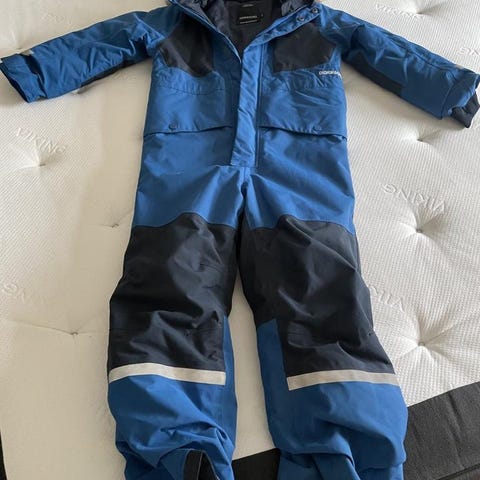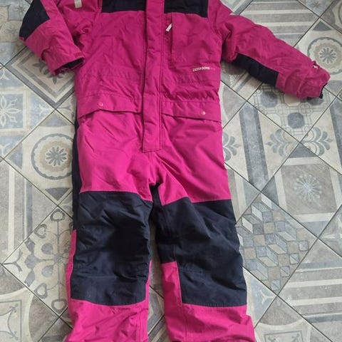 Inga hål, men lite blekt på skyddslapparna, i övrigt bra skick. Man kan byta de utbytbara fotremmarna, och sprätta upp sömmar i ben och ärmar för att göra den lite längre (ej gjort)