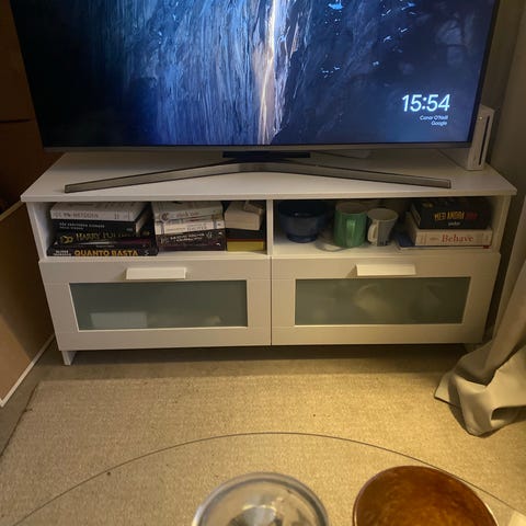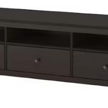 BRIMNES TV-bänk i svart färg. Möbel med flera förvaringsfack och skjutdörrar med frostat glas. Passar för förvaring av elektronik och media i vardagsrum eller liknande utrymmen.