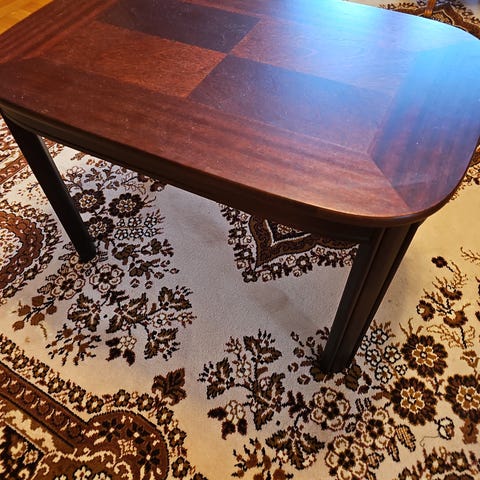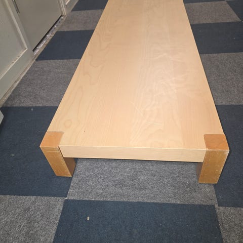 Ett stilrent soffbord med trästruktur och metallben. Perfekt för vardagsrummet.