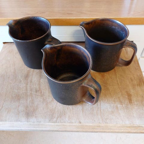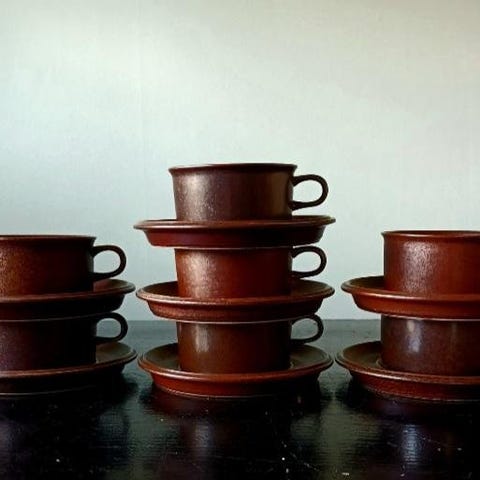 Ett helt sortiment av olika Arabia Ruska koppar och fat i olika storlekar inkl en kanna.