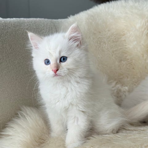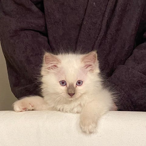 Det här är en ovanligt social och pratglad kattunge som gärna är med överallt. Han söker kontakt, följer efter i hemmet och vill vara delaktig i vardagen. Nyfiken, trygg och glad – en katt som verkligen uppskattar sällskap och närhet. Typiskt Ragdoll-temperament.