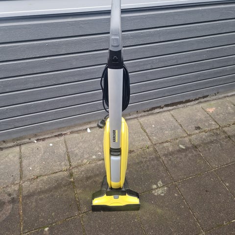 Kärcher ångmopp i gul och svart färg. Används för rengöring av hårda golv med hjälp av ånga. Utrustad med sladd för strömförsörjning.