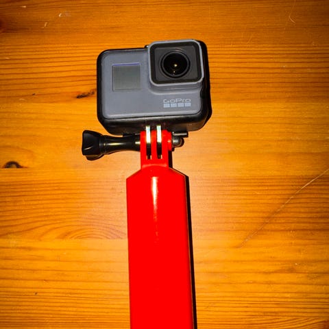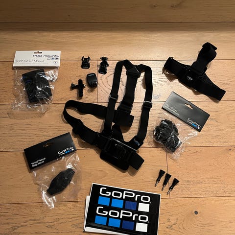 GoPro Hero 7 Black med olika monterings- och fästanordningar.