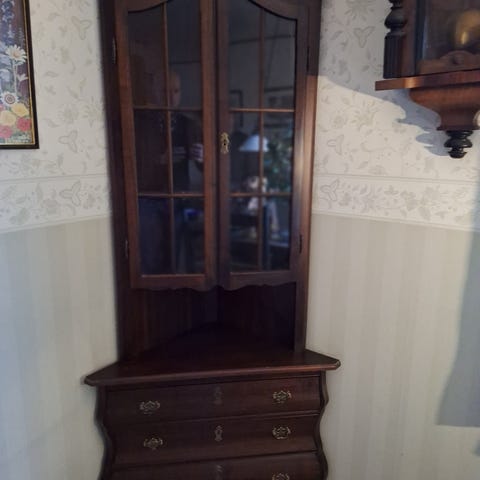 Väldigt nätt hörnskåp i massivt trä målad i vacker ljusgrå.