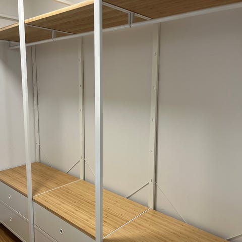 Vit hylla i tre delar. Av plåt. Total höjd 240cm. Delarna är 60cm, 60cm och 120cm. En del för skoförvaring, en del med klädstång och en del för till exempel lådor eller korgar. Delarna går att stapla på varandra eller användas var för sig.