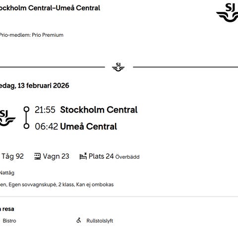 Flygbiljett Umeå - Arlanda tur (12/2) o retur (15/2)