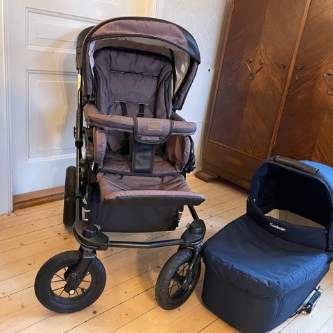Emmaljunga barnvagn med svart tyg och bruna detaljer på handtag och fotstöd. Barnvagnen har fyra hjul och justerbart handtag. 5år gammal