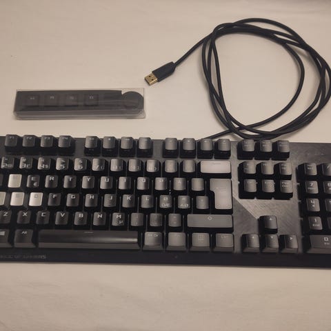 Corsair K70 tangentbord med USB-anslutning. Tangentbordet har ett numeriskt tangentbord och är utformat för användning med datorer.