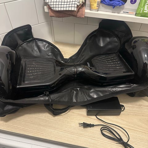 Hoverboard i färgerna grön och svart inklusive en bärväska och laddare. Produkten är bärbar och avsedd för personlig transport.