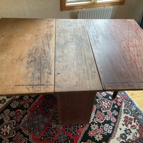 Klaffbord Derri av mangoträ med två fällbara klaffar. Höjd 72 cm. Stl bordsskiva med klaffarna nedfällda 60x43,5 cm. Stl på varje klaff 60x22 cm. Bordsskivans totalmått med uppfällda klaffar 60x87,5 cm.
